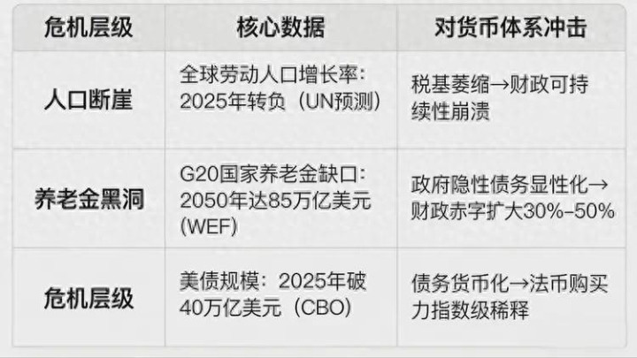 现在的情况比以前更严峻。全球主权债务都突破100万亿美元了,美国国债超40万亿,日本国债更是GDP的265%,这些债务根本还不上。更要命的是,年轻人越来越少,养老金缺口越堆越大,未来30年可能超70万亿美元。政府没钱怎么办?要么加税要么印钱,加税没人扛得住,只能疯狂印钞,这就意味着我们手里的钱越来越不值钱。